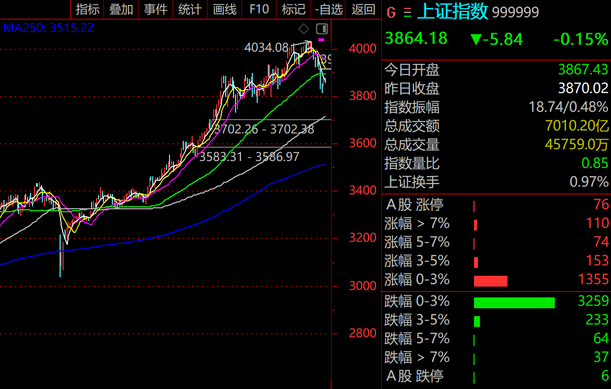 周三,A股弱势盘整,黄白线分化,强指数弱个股。上证指数微跌0.15%,报3864.18点;深证成指涨1.02%,报12907.83点;创业板指表现强势,大涨2.14%,报3044.69点。