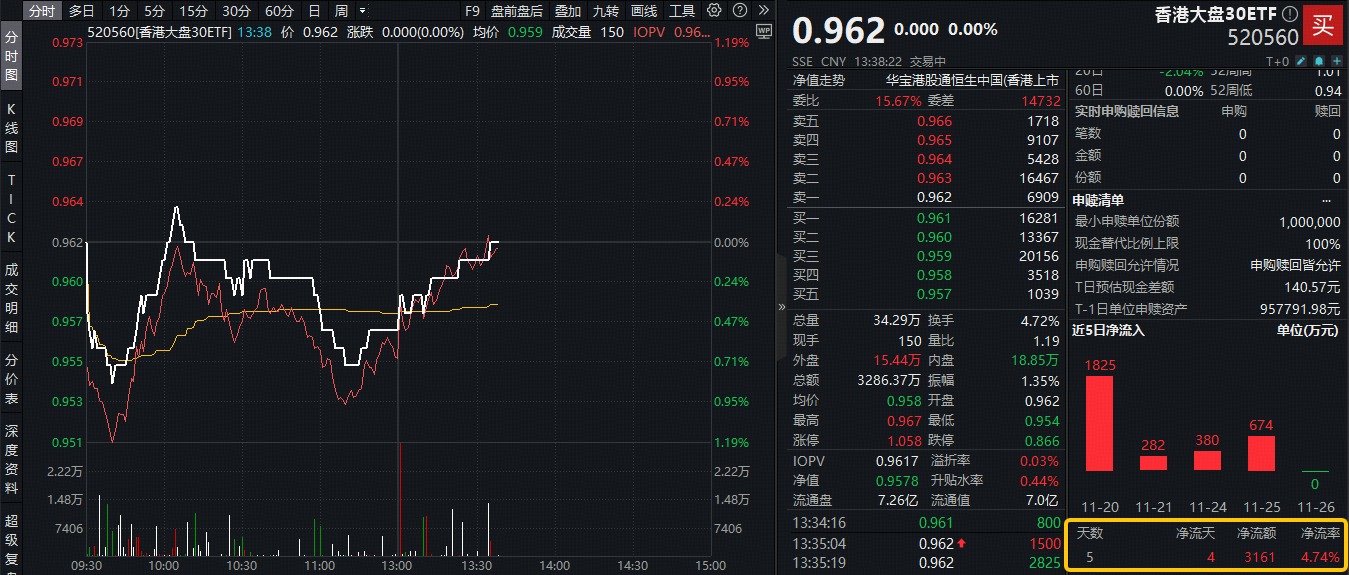 自带“科技+红利”哑铃策略的——香港大盘30ETF(520560)在经历此前的日线3连涨后,今日(11月27日)微跌休整,当前在水面附近震荡,或为资金提供了倒车接人的机会,事实上,该ETF场内频现溢价区间,显示买盘资金更为强势!