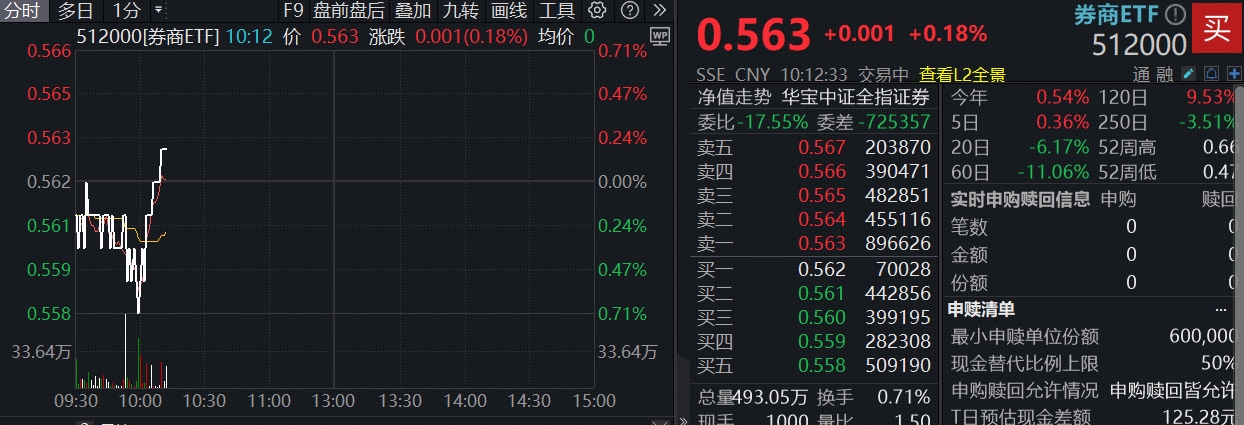 11月28日,券商板块走势活跃,389亿顶流券商ETF(512000)自水下拉升翻红,场内价格现涨0.18%。个股多数飘红,湘财股份、兴业证券涨超1%。