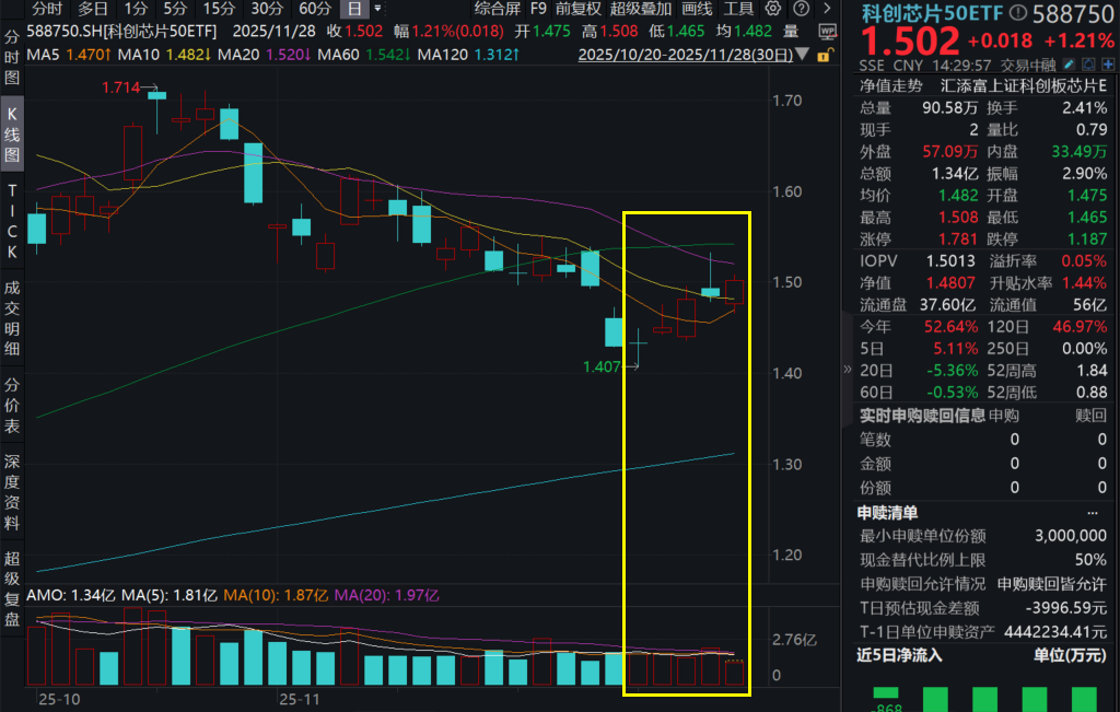 11月28日,A股市场震荡上行,硬科技板块低开上冲。截至14:30,科创芯片50ETF(588750)涨超1%,冲击五连涨!盘中溢价频现,反映买盘活跃!