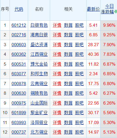 早盘,黄金概念板块表现活跃,截止发稿白银有色涨停,湖南白银涨超9%,盛达资源、江西铜业涨超7%,豫光金铅、合邦生物、云南铜业、铜陵有色、山金国际涨超6%,紫金矿业、洛阳钼业、北方铜业等涨超5%。