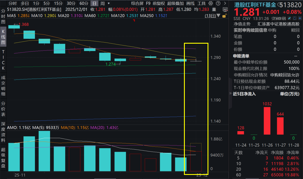 12月1日,港股市场走势分化,港股红利震荡上行,截至13:30,港股红利ETF基金(513820)微涨0.08%,盘中溢价频现,当前达0.47%,或反映买盘活跃!资金持续借道ETF涌入港股红利板块,港股红利ETF基金(513820)近20日强势吸金超4.6亿元,最新规模超39亿元,同指数断层领先!