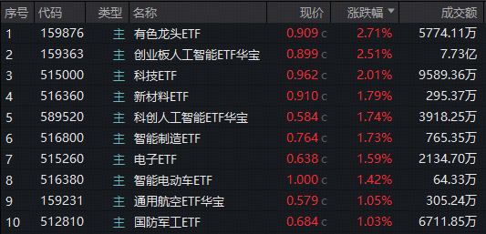 科技方面,AI主线强势依旧,光模块含量超56%的创业板人工智能ETF(159363)场内放量大涨2.51%,重点布局国产AI产业链的科创人工智能ETF(589520)场内收涨1.74%!商业航天集体走强,场内热门国防军工ETF(512810)、通用航空ETF华宝(159231)场内均涨超1%。