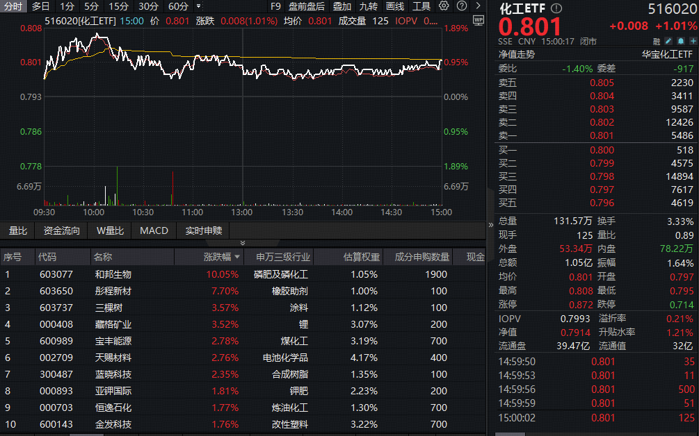 成份股方面,磷化工、橡胶助剂、锂电等板块部分个股涨幅居前。截至收盘,和邦生物涨停,彤程新材飙涨7.7%,三棵树、藏格矿业双双涨超3%,宝丰能源、天赐材料、蓝晓科技涨超2%。