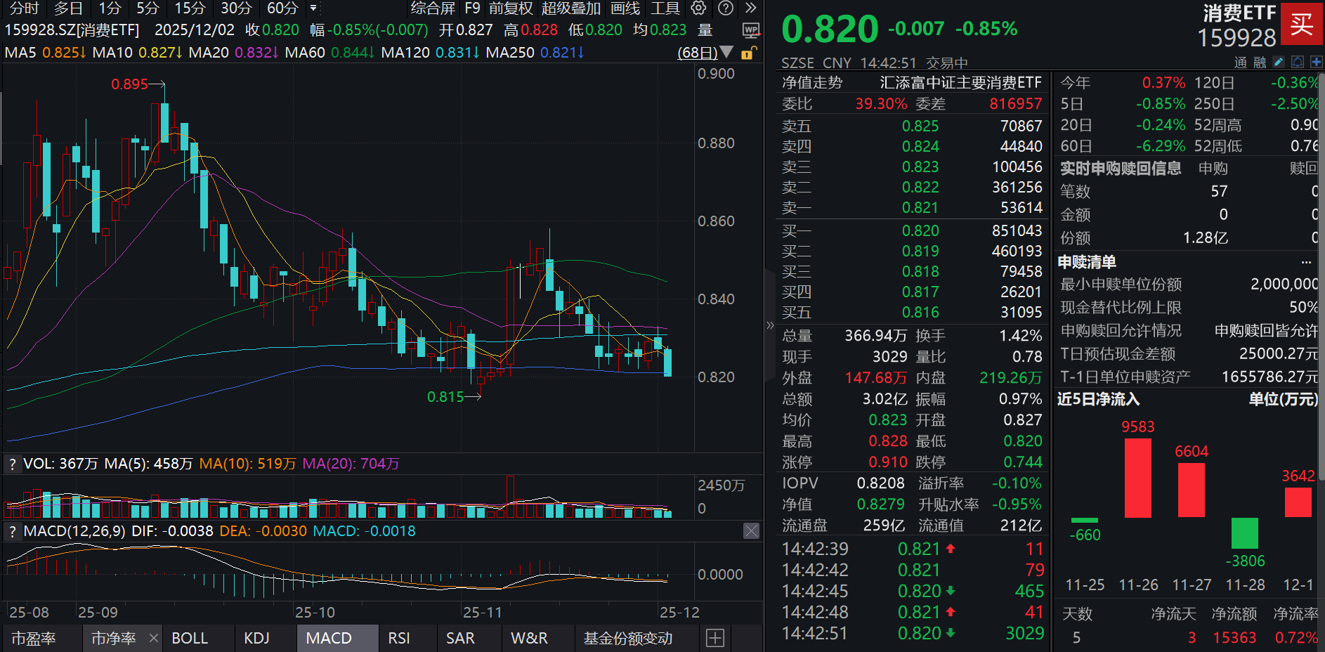 今日(12.2),大消费板块震荡走低,消费ETF(159928)跌近1%,成交额超3亿元。资金面上,消费ETF(159928)盘中再获净申购1.28亿份,近20日累计“吸金”超4.5亿元!截至12月1日,消费ETF(159928)最新规模超214亿元,同类断层领先!