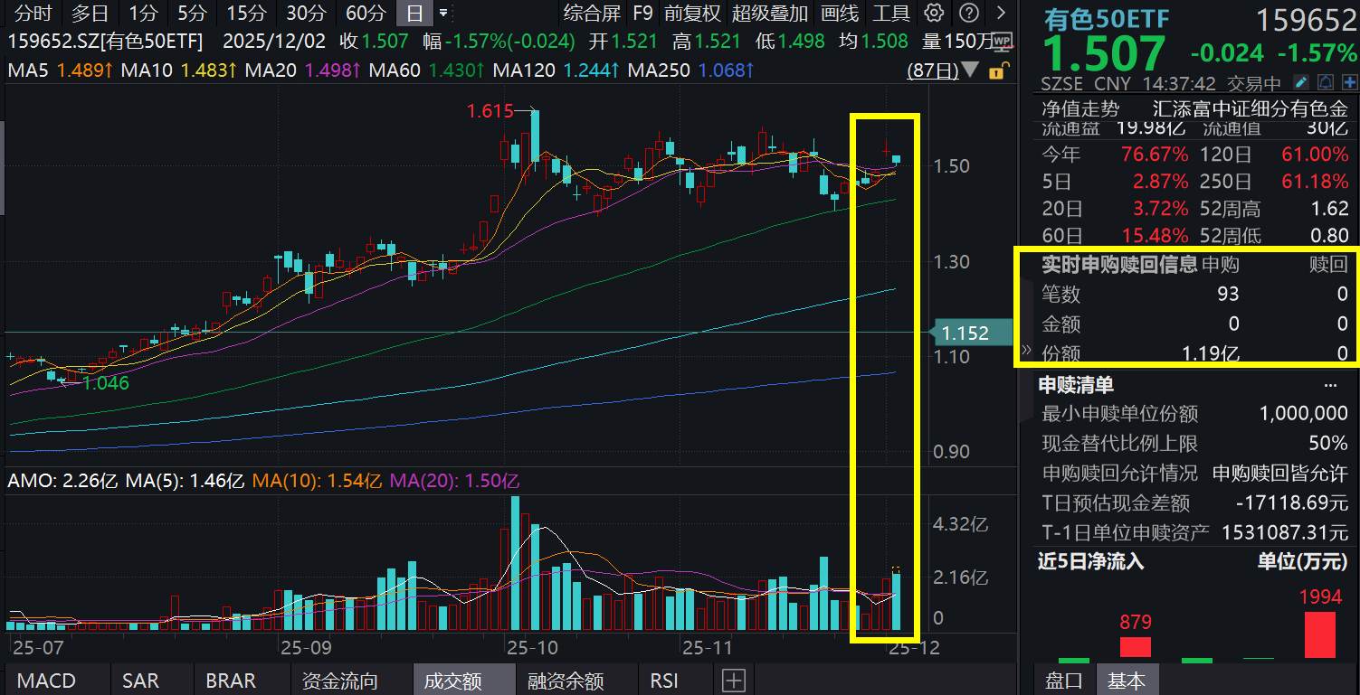 12月2日,A股市场多数回调,沪指失守3900点,有色50ETF(159652)跌1.57%,一度跌超2%,资金逢跌跑步进场,盘中有色50ETF(159652)强势“吸金”超1亿元。