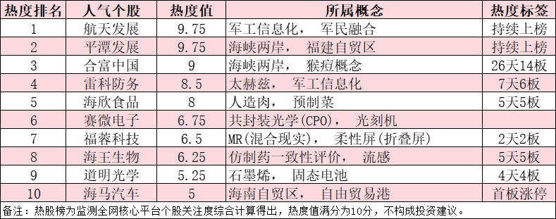 今日,A股十大人气热股如下:航天发展、平潭发展、合富中国、雷科防务、海欣食品、赛微电子、福蓉科技、海王生物、道明光学、海马汽车。