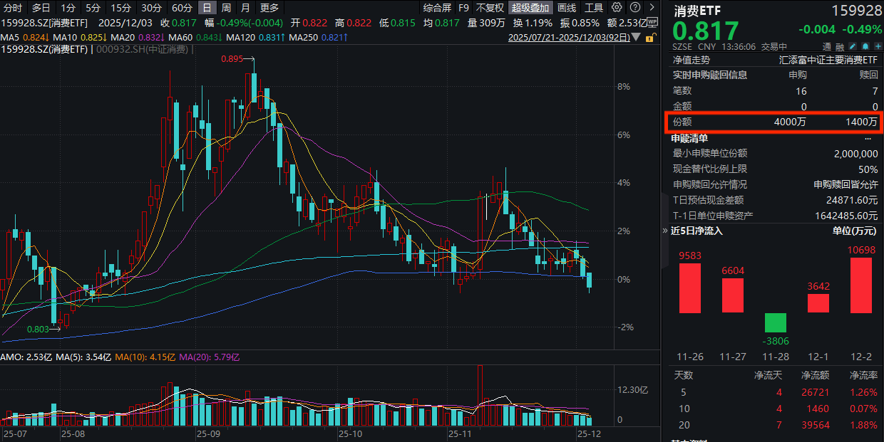 今日(12.3),大消费板块震荡走低,消费ETF(159928)跌0.49%,连续第三天下跌,成交额超2.5亿元。资金面上,消费ETF(159928)盘中再获净申购2600万份,昨日净流入1.07亿元,近20日大举“吸金”超3.9亿元!截至12月2日,消费ETF(159928)最新规模超213亿元,同类断层领先!