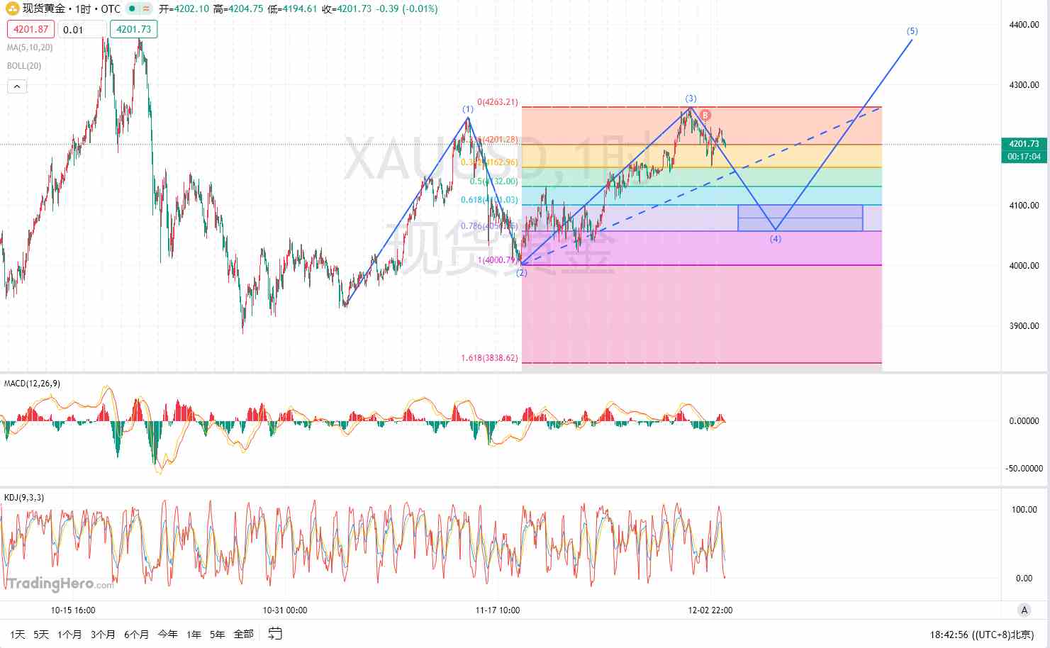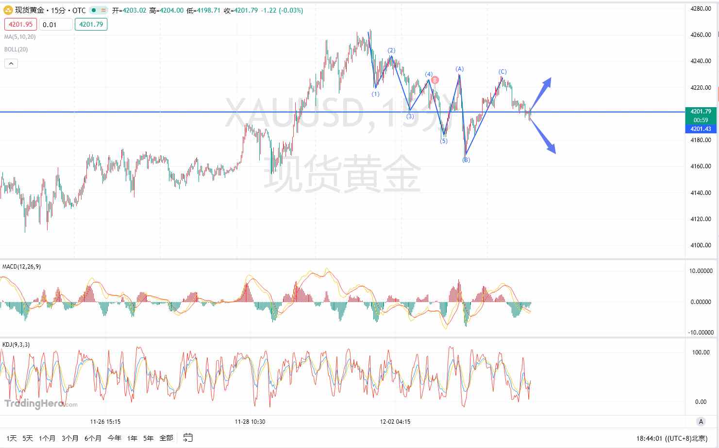 12月3号受美联储加息影响,美黄金一路高歌猛进 近期美联储频频传出鲍威尔下台传言,而川普公开喊话老鲍下台人心惶惶;今日凌晨三点,川普再次公开讲话认为美联储应该降息,摩根大楼戴蒙力挺,或将市场风险利好面偏好。 基本面 昨日现货黄金收盘于4205.68,今开4207.06,日内最高4228.91,最低4194.61,午后欧盘开盘黄金价格突破亚盘最低4200一线,当前处于窄幅下行趋势。 技术面 小时线级别黄金呈5浪上涨结构走波浪上行,目前处于三浪高点位于4260附近,后续的整体趋势个人认为会走延续的4-5浪震荡上行,(市场的波动永远是随着人的贪婪与恐惧而上下起伏),那么后续4浪下跌到4060附近大概率是没有问题的,不过第二浪行情走出的非常顺利,那么第四浪就会比较复杂。 从短期15分钟线上看,金价自4260开始走短期内的5浪下跌+ABC调整,而A浪以及C浪的调整最高点均为有效突破4230这一关口位置,同时此处位置存在较为密集成交区,那么短期此位置依旧是目前高点压力,下方整数关口4200也存在短期支撑,若晚间能有效突破这一关口则能看到4180-4160附近,若未有效突破则上方4230的压力可能会被继续试探!