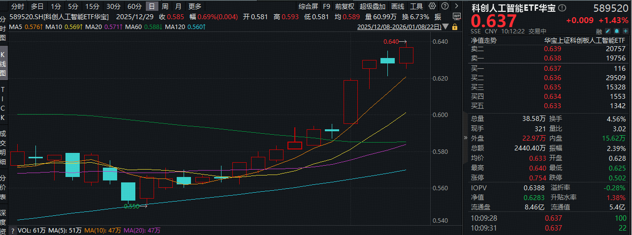 1月8日早盘,重点布局国产AI产业链的科创人工智能ETF华宝(589520)场内涨幅盘中上探1.91%,现涨1.43%,当前站在所有均线上方,近15个交易日中,有10个交易日上涨,或已走出坚定的“上行台阶”。