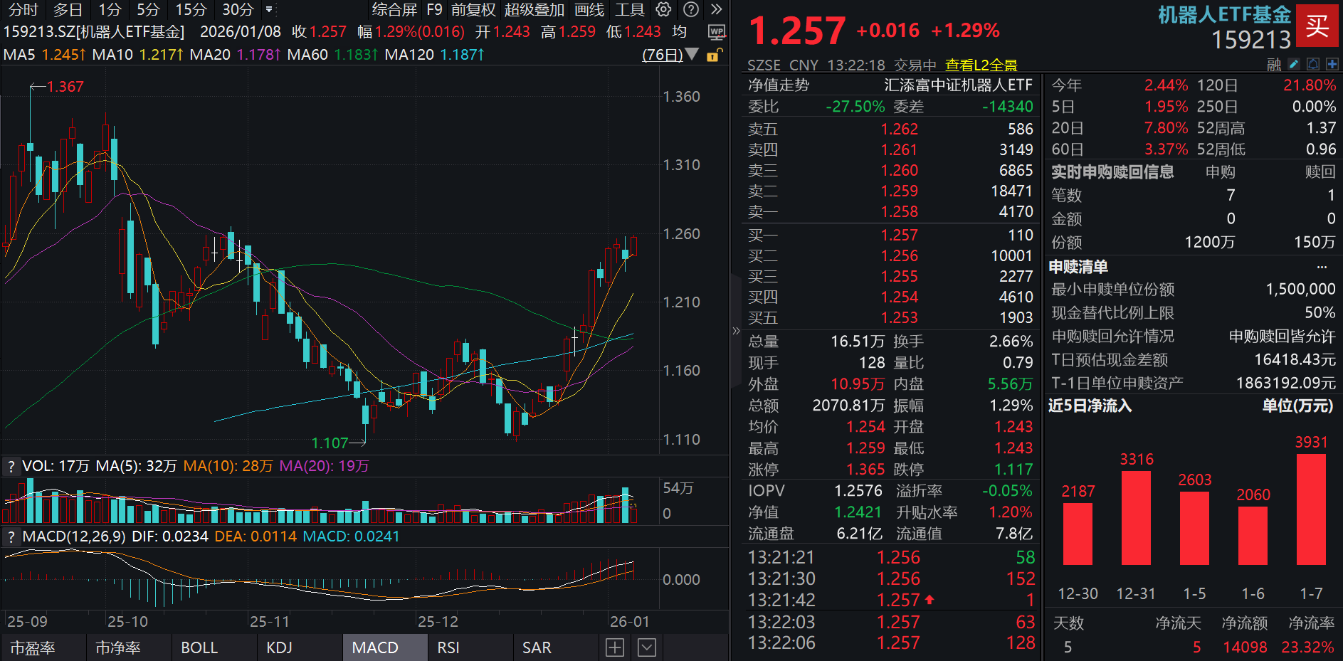 1月8日,A股市场震荡上行,沪指走红冲击15连阳,机器人板块继续强势!截至13:22,机器人ETF基金(159213)涨1.29%,轻松反包昨日跌幅,盘中强势吸金超1300万元,加上今日已连续8日强势吸金近2亿元!