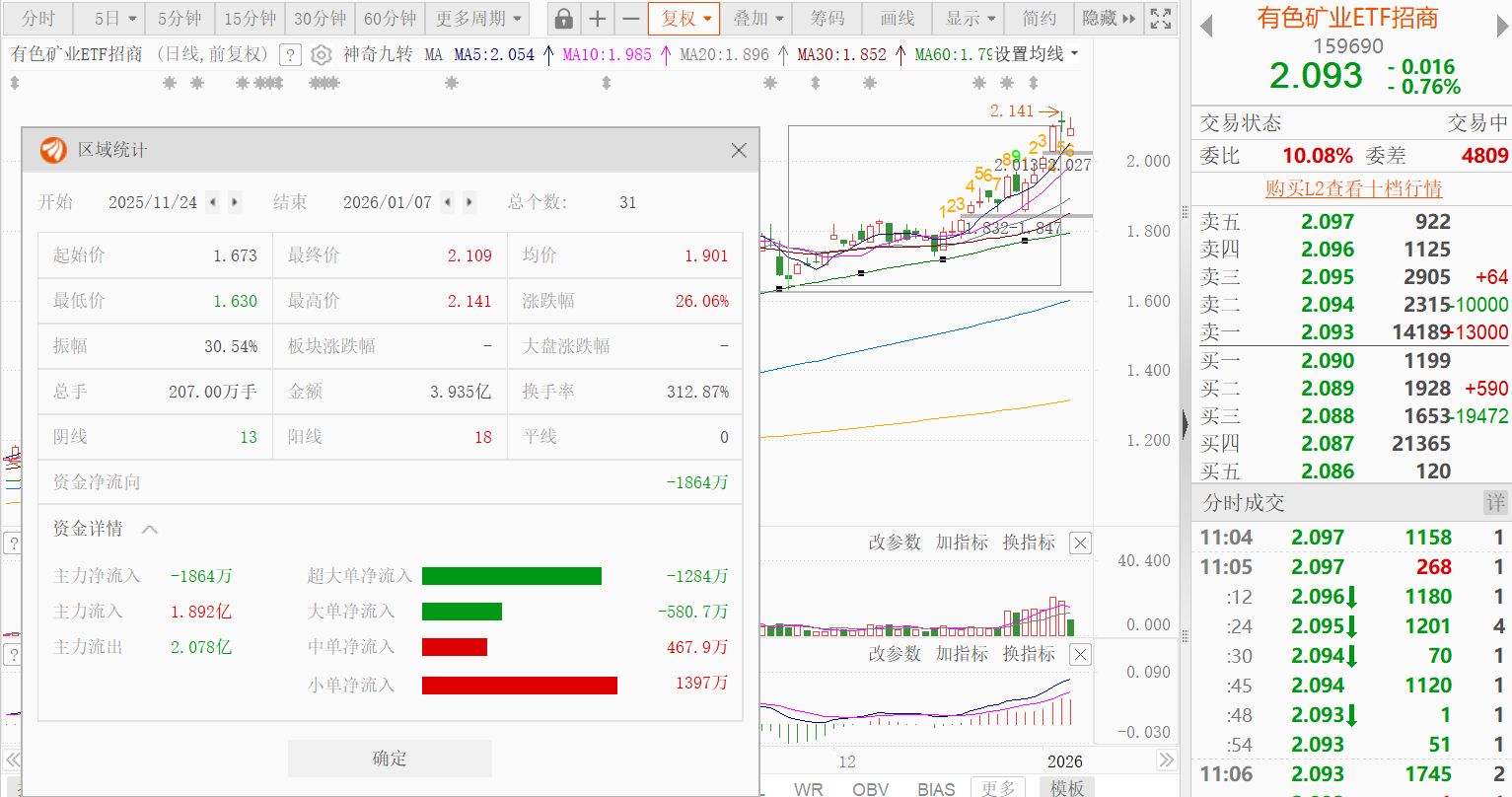 年初以来,有色板块与卫星被誉为“天上地下”的双子星组合,其中有色矿业ETF招商(159690)从11月24日至1月7日累计涨幅高达26%,大幅跑赢市场。经历了短期的疯狂后,今日迎来小幅修整,盘中跌幅达到1%。成份股中,云南锗业涨超6%,驰宏锌锗、宝钛股份、云南铜业、江西铜业等上涨,其余均不同程度下跌。