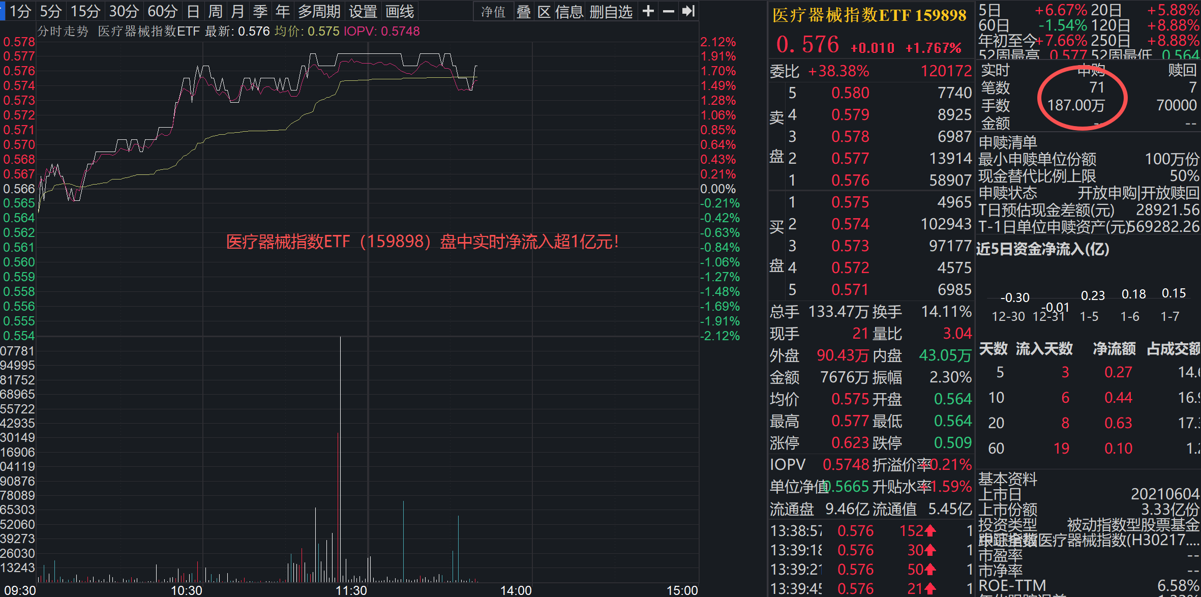 截至发稿,含“脑”量24%的医疗器械指数ETF(159898)盘中涨超1.76%,按实时净值估算盘中获超1亿元资金净流入!