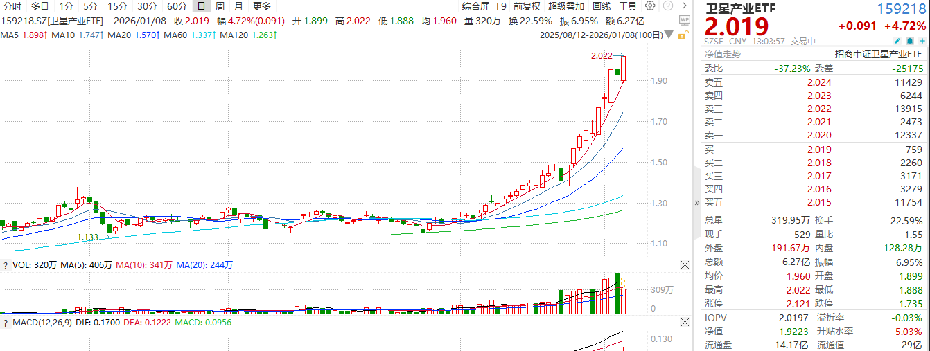 1月8日,商业航天热度继续居高不下,卫星产业ETF(159218)盘中涨幅一度超过4%!截至发稿,其最新涨幅为4.72%;资金方面,连续获得4日净流入,累计超10亿,商业航天投资逻辑获得市场关注。