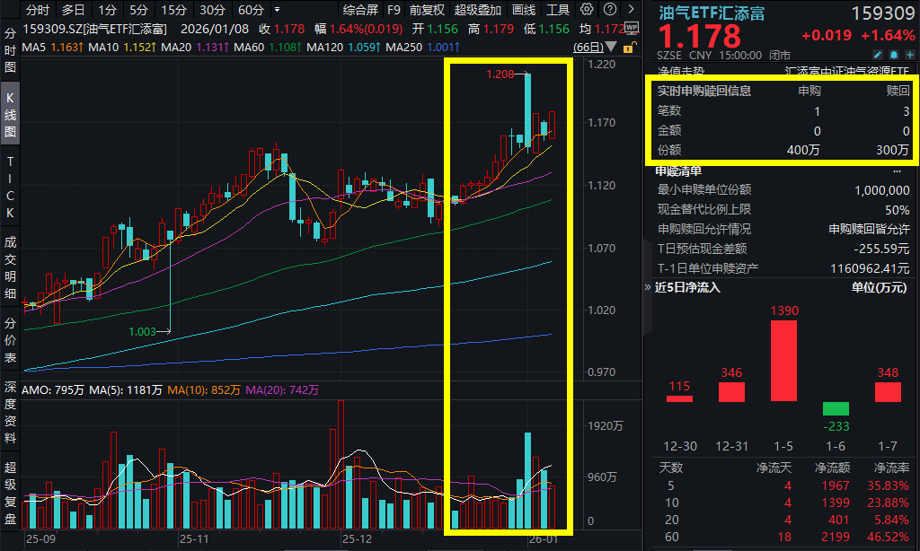 1月8日,A股市场震荡上行,沪指微跌0.07%,录得15连阳。受地缘冲突催化,油气板块大涨,油气ETF汇添富(159309)涨超1.6%,全天再获117万元净流入,已连续两日吸金!