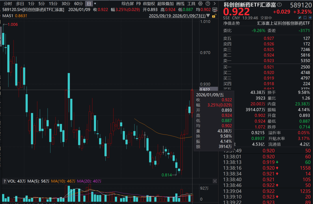 1月9日,A股市场震荡上行,沪指时隔10年重回4100点,A股创新药午后劲爆拉升,截至发稿,20CM创新药新物种——科创创新药ETF汇添富(589120)涨超3%,反包昨日跌幅!
