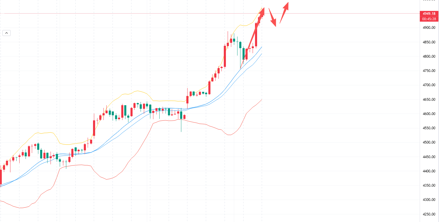 目前接近5000这个比较重要大整数关口,看多手里有多的朋友还是需要注意一下。加之今日又是周五收周线,行情容易突发异动,可能会冲高随时引发回调。