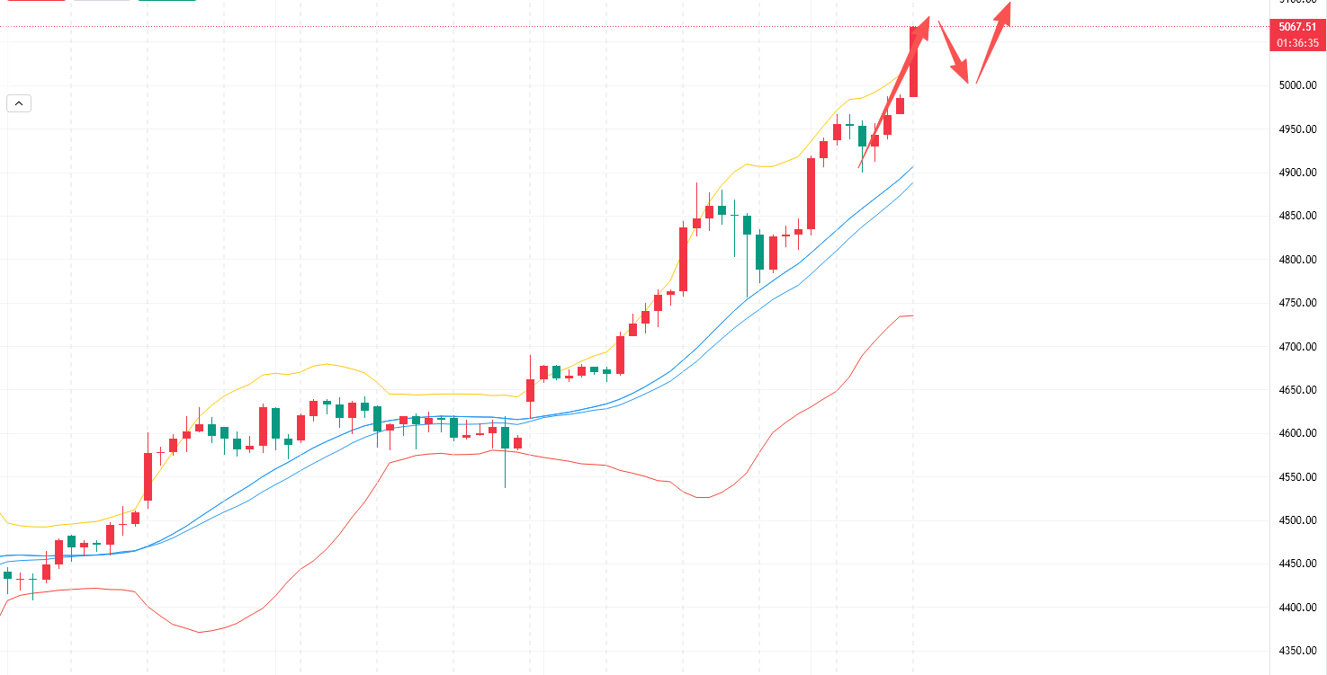 目前黄金走势及其强势,站稳5000后大目标看向5200,但短期警惕技术面超买后引发的回调也不容忽视。短期关注5100附近阻力,不破可以轻仓试空。下方支撑关注5000-4980,回落接近分批布局多,意外回落4900附近也是多。