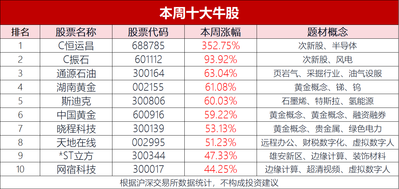 本周十大牛股如下:C恒运昌、C振石、通源石油、湖南黄金、斯迪克、中国黄金、晓程科技、天地在线、*ST立方、网宿科技。