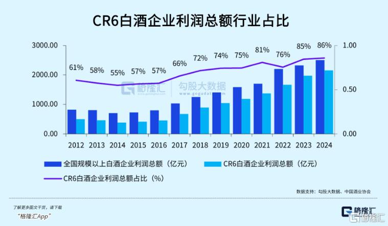 白酒行业CR6企业——茅台、五粮液、山西汾酒、泸州老窖、洋河、古井贡酒,其利润总额占行业的比重从2014年的55%提升至2024年的86%,逐年增长。
