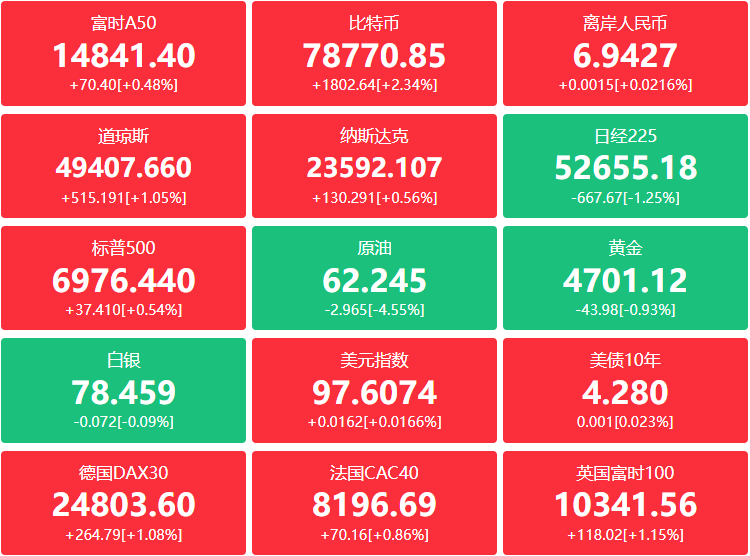 期货:现货黄金跌4.54%报4671.58美元;黄金期货跌0.90%报4702.60美元;现货白银跌6.73%报79.4438美元;白银期货涨1.56%报79.760美元;铜期货跌1.49%报5.8345美元,现货铂金跌2.93%,现货钯金涨0.74%。原油期货收跌3.07美元,跌幅4.71%报62.14美元;布伦特原油报66.30美元;天然气期货跌超25.65%报3.2370美元;汽油期货报1.8514美元,取暖油期货报2.3598美元。