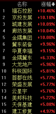 早盘京津冀概念集体高开,截止发稿福石控股、京投发展、城建发展、廊坊发展、金隅集团、冀东装备涨停,华夏幸福涨超9%,金隅冀东涨超6%,大龙地产、科锐国际、首都在线、荣盛发展等涨超5%。