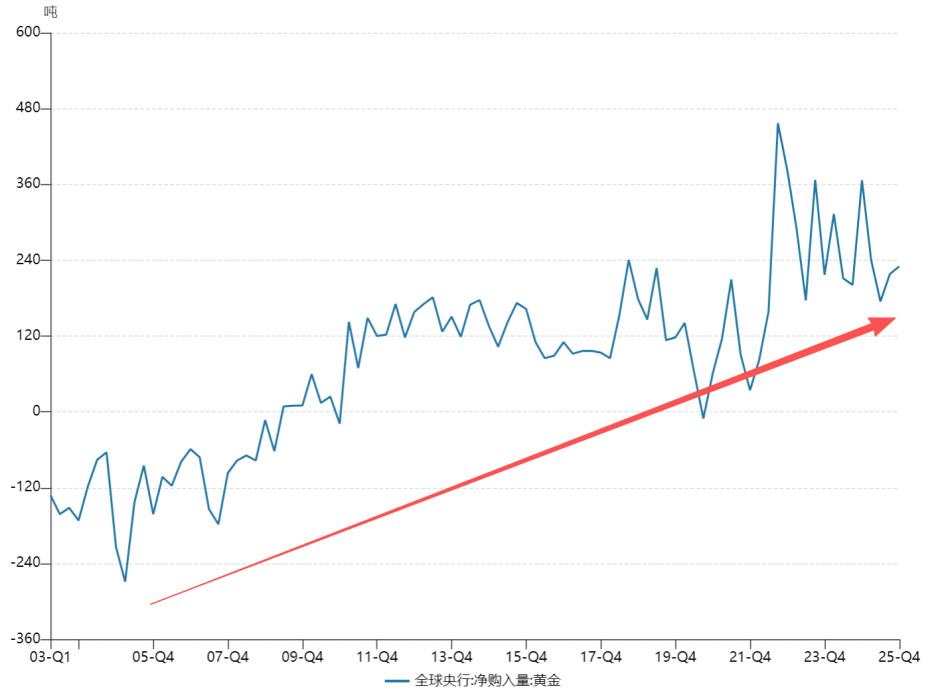 图片趋势描述:观察长期趋势,全球央行对黄金的净购入量已形成较明显的上升通道,这为贵金属价格提供了非投机性的底层支撑。
