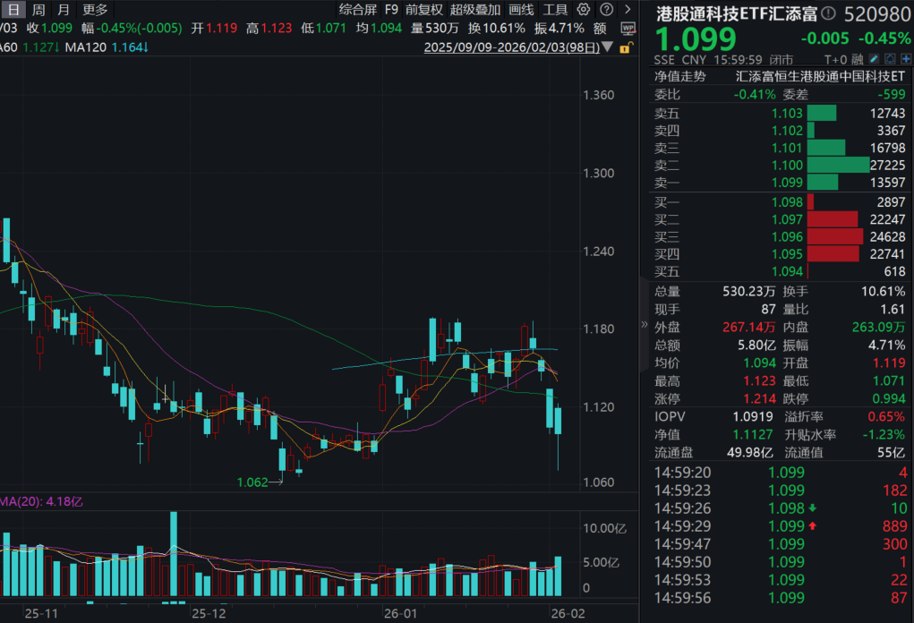 今日(2.3),受消息面刺激,港股科技再度飘绿,100%纯度的港股通科技ETF汇添富(520980)探底回升收跌0.45%,连续第四日回调,全天成交额大增至近6亿元!资金昨日再度涌入,今日收盘溢价率达0.65%,或反映资金逢跌布局意愿!