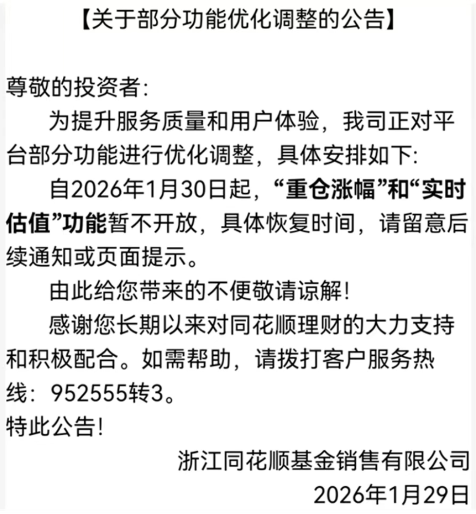 以同花顺为例,其于近日公告,自1月30日起暂停"重仓涨幅"与"实时估值"功能,以提升服务合规性;京东金融则先行一步,于1月29日即下架"基金估值"功能,并同步关闭"实盘牛人榜"等可能引发跟风交易的数据展示板块。此类调整旨在减少盘中估算净值对投资者的非理性诱导,引导长期价值投资理念。