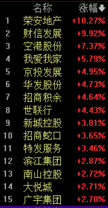 早盘,房地产概念板块卷土重来,荣安地产、财信发展涨停,空港股份涨超7%,我爱我家涨超5%,京投发展、华发股份、招商积余、世联行涨超4%,新城控股、招商蛇口、特发服务涨超3%,滨江集团、南山控股、大悦城等涨超2%。