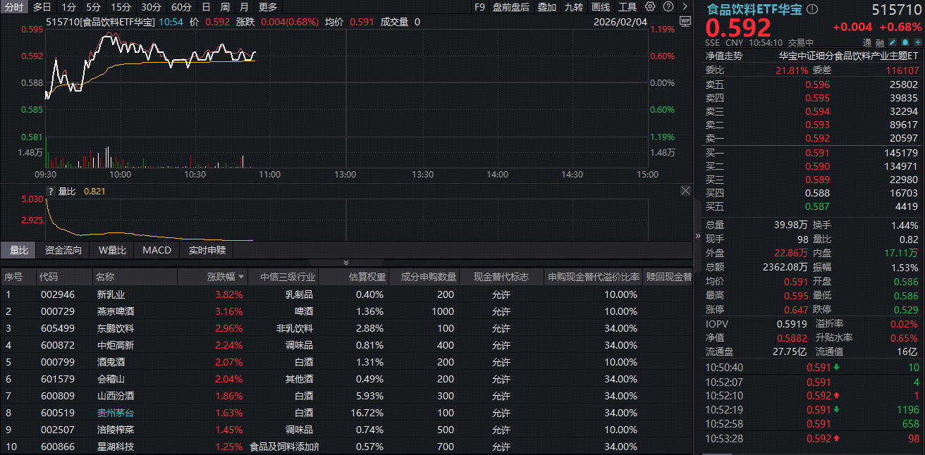 成份股方面,白酒、大众品均有亮眼表现。截至发稿,新乳业、燕京啤酒双双大涨超3%,酒鬼酒、东鹏饮料等涨超2%,贵州茅台、山西汾酒、泸州老窖等多股涨超1%。