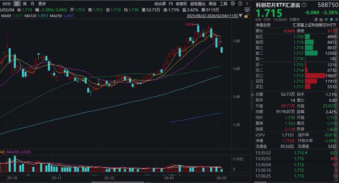 今日(2.4),科创芯片板块回调,科创芯片ETF汇添富(588750)跌3.38%,盘中成交额已逼近1亿元!资金面上,近5日有4日获资金青睐,累计“吸金”超1.6亿元!
