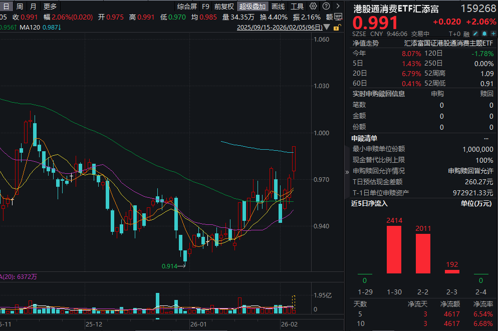 今日(2.5),大盘再度震荡,资金高低切换,消费板块走强。聚焦纯正新消费的港股通消费ETF汇添富(159268)放量涨超2%!资金持续青睐,近5日有3日获净流入,累计“吸金”超4600万元!
