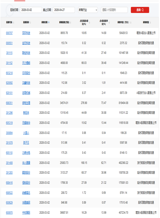 【限售解禁】