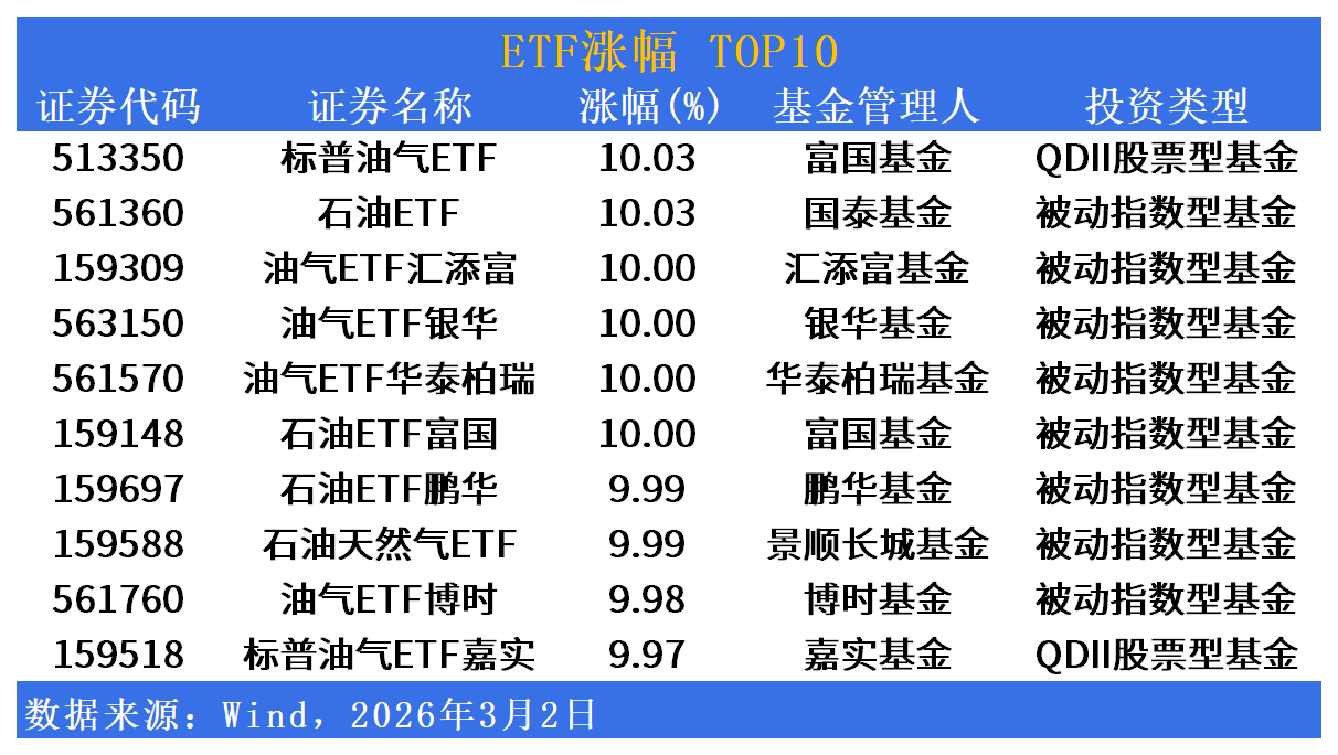 油气ETF汇添富(159309)、油气ETF银华(563150)、油气ETF华泰柏瑞(561570)涨幅均达10%,石油ETF富国(159148)、石油ETF鹏华(159697)、石油天然气ETF(159588)涨幅亦在9.97%-10%之间,板块呈现普涨格局。
