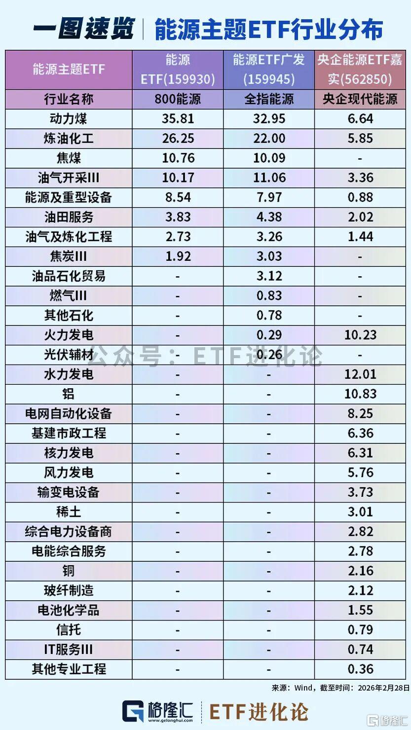 目前A股能源主题ETF指数跟踪四种指数:800能源、全指能源、央企现代能源和易盛能化A。