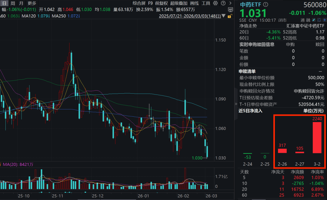 今日(3.3),A股下挫明显,市场逾4800股下跌,中药ETF(560080)收跌1.06%四连阴,盘中价创去年5月13日以来新低,全天成交额超6500万元。资金连续3日青睐,中药ETF(560080)昨日“吸金”超2200万元,近3日累计净流入超2600万元!