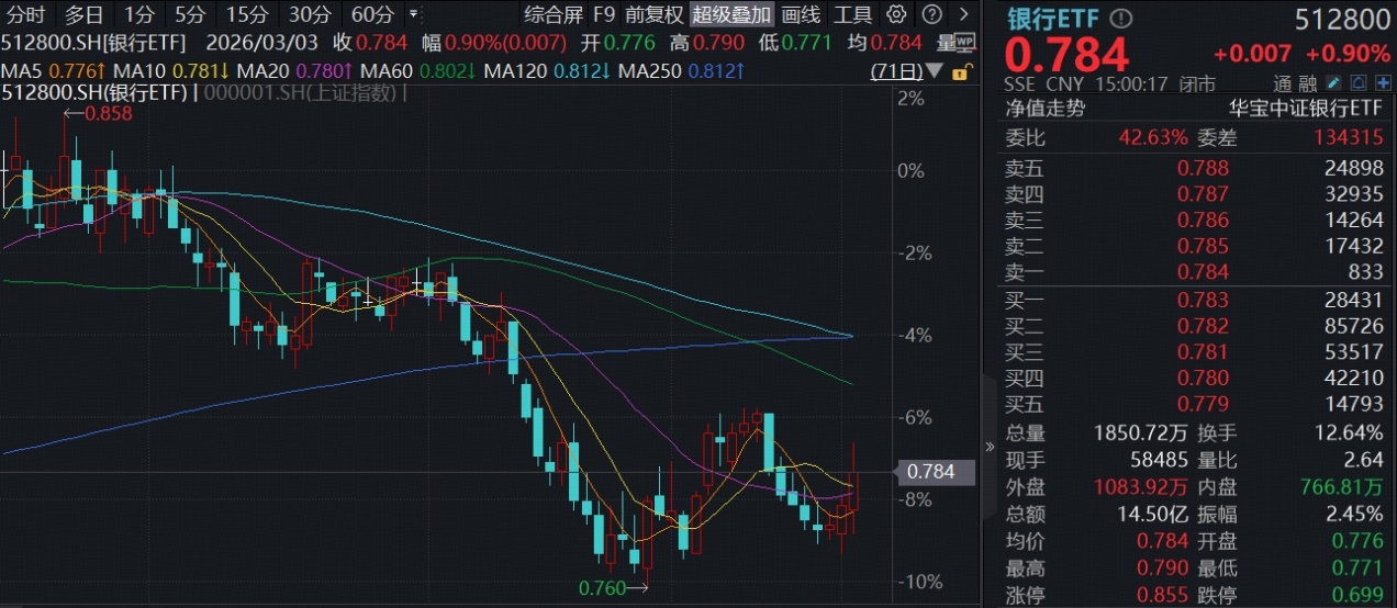 地缘冲突加剧导致全球避险情绪升温,银行股逆市走强。全市场规模最大的银行ETF(512800)场内价格一度上涨1.67%,收涨0.9%,日线稳步3连阳,收复10日、20日两条重要均线,全天成交额14.5亿元,创2025年12月以来天量。