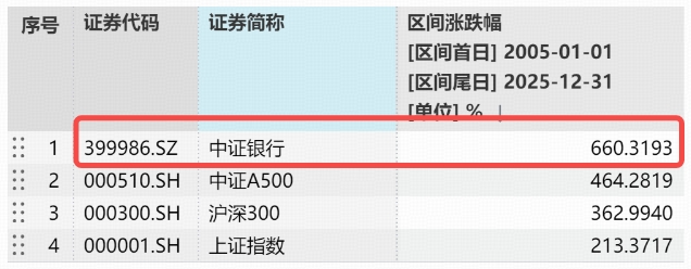 另一方面,从历史长期表现看,银行板块具备优异的抗风险能力。数据显示,截至2025年末,中证银行指数自2005年以来累计收益率高达660.32%,显著领先上证指数、沪深300等主流宽基指数。