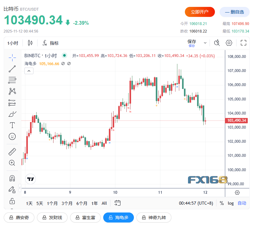 风险偏好改善并未惠及加密货币市场。周二,比特币下跌超2.4%至103,170美元,结束前一日短暂反弹。尽管美国政府结束停摆、市场风险溢价下降,但投资者选择回流股市与黄金,而非数字资产。