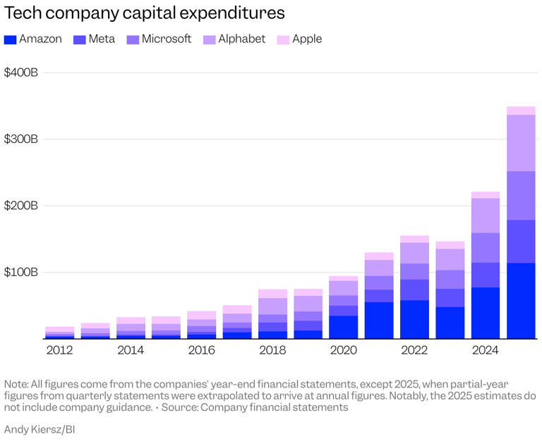 高盛指出,这一历史现象正在AI产业中重演。当前,科技巨头正以前所未有的规模扩充AI基础设施。亚马逊、Meta、微软、Alphabet及苹果五大科技巨头预计将在2025年合计投入约3,490亿美元资本支出,较疫情前水平增长逾70%。