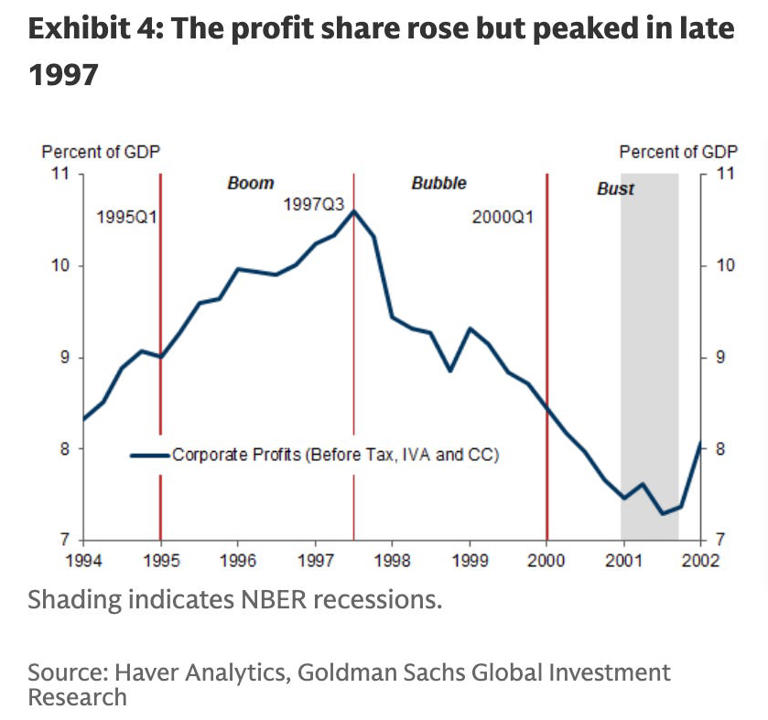 高盛在报告中指出:“当年的盈利峰值出现在泡沫破裂数年前。尽管企业账面利润仍显强劲,但宏观数据中的盈利能力已经开始下滑。”
