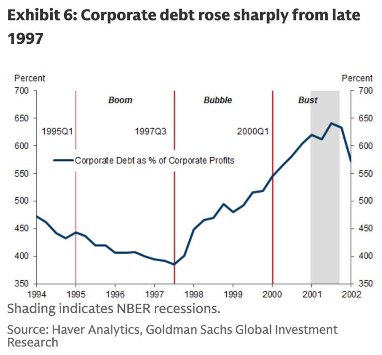 互联网泡沫破裂的另一大特征是企业债务急速累积。高盛数据显示,企业债务与利润之比在2001年触及历史高位,几乎与互联网泡沫破裂时间完全重叠。