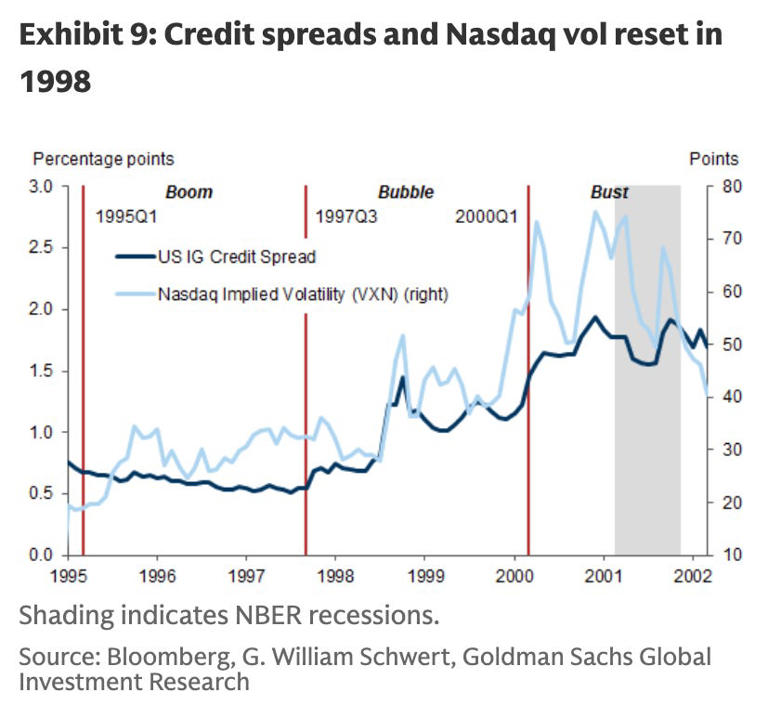高盛分析认为,这种趋势“值得高度关注”,因为在历史上,信用利差往往在股市见顶的两年前开始扩大——正如互联网泡沫破裂前的1998年和1999年那样。