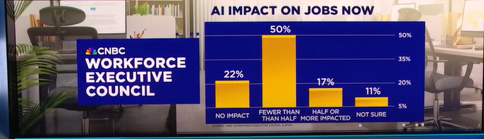 在 21 位受访高管中:约 50% 表示 AI 目前影响不到公司岗位的一半;17% 表示 AI 影响了近半数或超过半数职位;22% 表示目前“没有影响”;11% 不确定。