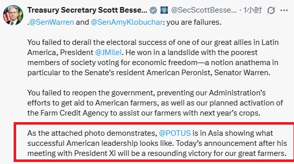 贝森特周四在社交媒体X平台发文说:“今天,特朗普与习近平主席会晤后宣布的消息,对我们伟大的农民来说,将是一项意义重大的胜利。”
