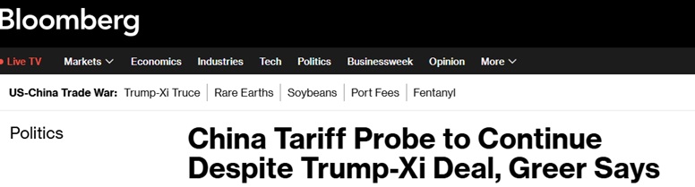 彭博社指出,不暂停调查的决定可能会让特朗普在与习近平的协议破裂时,拥有对中国加征新关税进行报复的工具。
