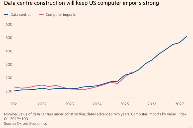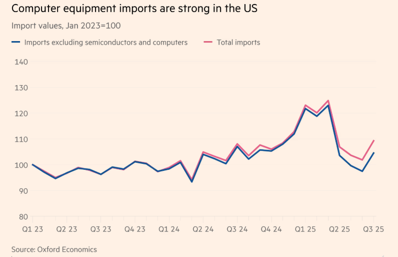 更糟的是,大量资本涌入AI项目——数据中心的设备在美国进口中占据不小比例,而这些项目至今尚未产生回报。一旦这一泡沫破裂,对美国经济增长的打击很可能超过1990年代末的科技泡沫破裂。