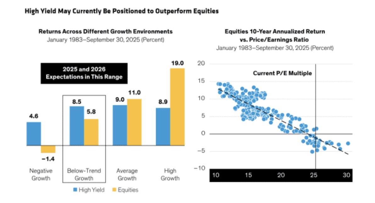 他们表示:“如果将部分股票持仓转入高收益债券,投资者可以显著降低整体波动性,而回报损失却相对有限。更重要的是,在当前高收益率与经济增长放缓并存的背景下,高收益债券与股票之间的回报与波动关系,可能比以往任何时候都更具吸引力。”