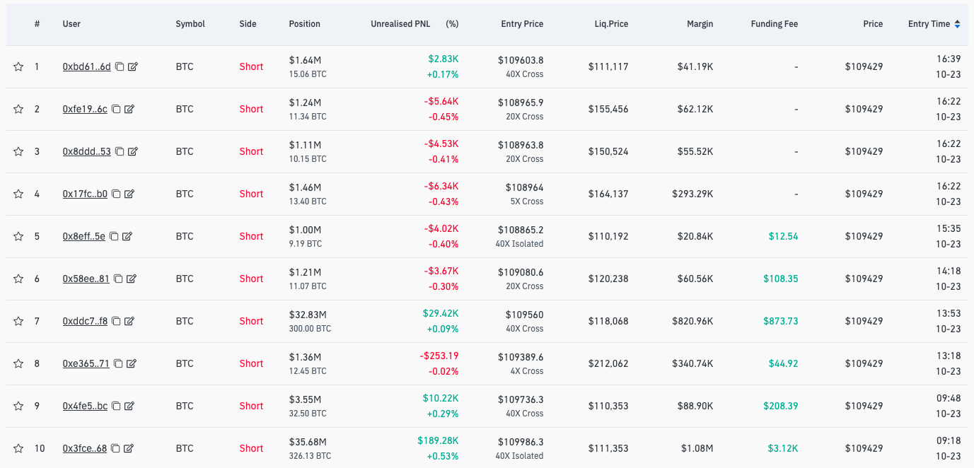 正如Cointelegraph此前报道,整个10月期间巨鲸的操作一直伴随着市场质疑,因为某些实体似乎提前获悉了新闻头条和特朗普的评论。这一现象最初出现在10月10日,当时BTC/USDT从历史高点跌至币安平台上的10.2万美元低位。
